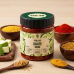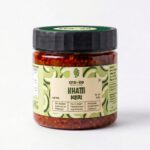 Gujarati-style mango pickle. Crafted with the finest Ladva Mangos from Gujarat and premium Kashmiri Chilli powder, it boasts a mild spiciness and vibrant red color. Enhanced with a blend of split mustard and fenugreek seeds, this pickle offers a flavorful and wholesome taste experience.